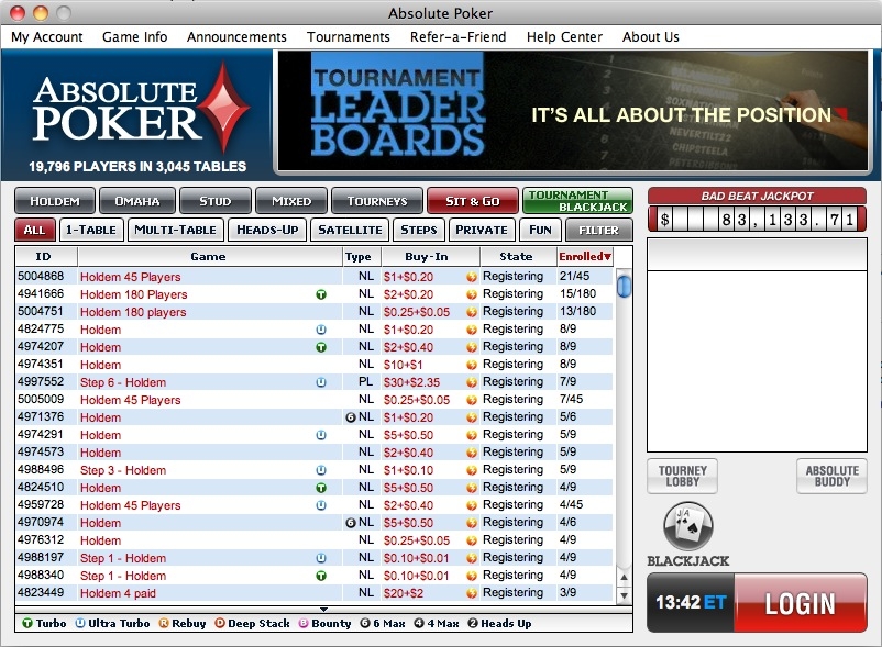 Absolute Poker has always had very good poker software, and currently offers both a Windows and a Mac version of their poker room. The lobby of the poker client is neat, and it is quite easy to find the game you are looking for. You can easily filter the games using a selection of tabs that are located on the top of the lobby.